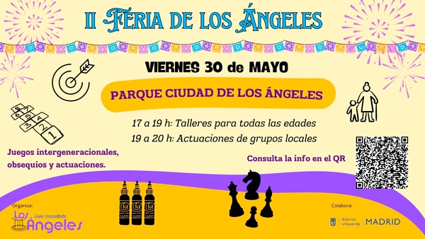 Desde las 17:00 hasta las 20:00 del viernes 30, celebraremos por segundo año esta feria en el Parque de la Ciudad de los Ángeles. Allí, los asistentes podrán participar en talleres, juegos y disfrutar de las actuaciones para todas las edades.