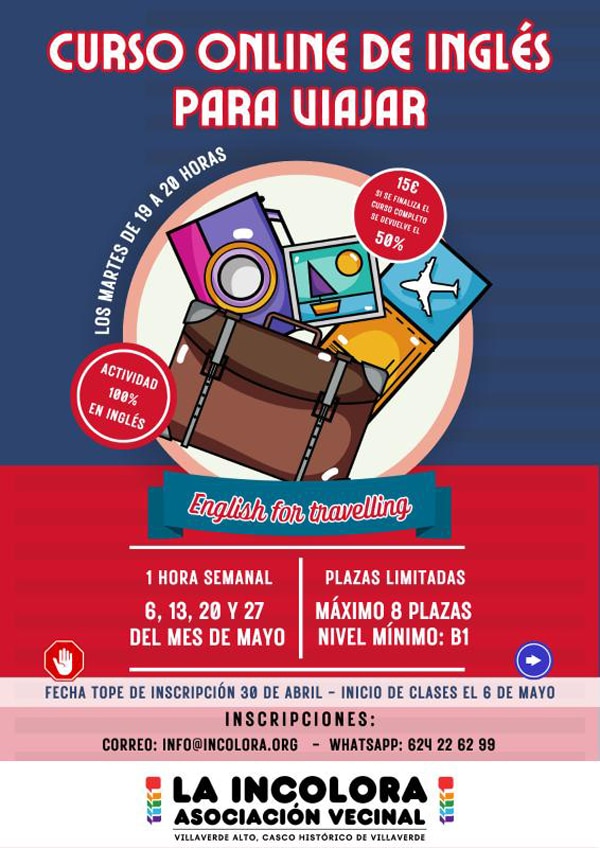 Desde la Asociación Vecinal La Incolora nos llega una propuesta interesante relacionada con el aprendizaje de idiomas. Se trata de un curso online de inglés para viajar, de una hora semanal, que se realizará los martes del mes de mayo de 19:00 a 20:00 (martes 6, 13, 20 y 27 de mayo).