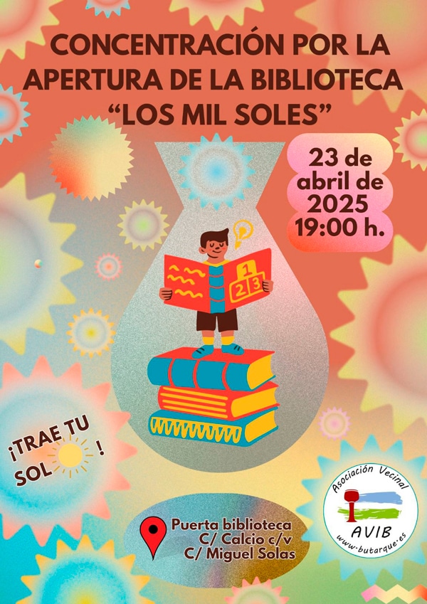 La Asociación Vecinal de Butarque, junto con otros colectivos y entidades del barrio, llevará a cabo una concentración para reivindicar la apertura de la “Biblioteca de los Mil Soles”, en la puerta del propio edificio (C/ Calcio – C/ Miguel Solas) coincidiendo con el Día del Libro, el próximo 23 de abril a las 19:00.