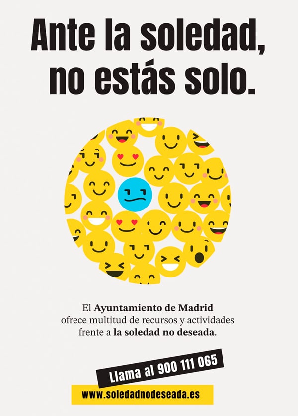 El Ayuntamiento de Madrid ha articulado un proyecto de ciudad contra la soledad no deseada y está reforzando las actuaciones municipales contra esta problemática social cuyo abordaje es una prioridad política desde el pasado mandato. En el marco del Proyecto Estratégico de Prevención de la Soledad no Deseada que están actualizando las áreas de Vicealcaldía, Seguridad y Emergencias —a través de Madrid Salud— y de Políticas Sociales, Familia e Igualdad, el Consistorio ha lanzado una campaña publicitaria con el doble objetivo de concienciar a la ciudadanía sobre esta realidad y de acercar a los afectados los recursos que ofrece para combatirla.