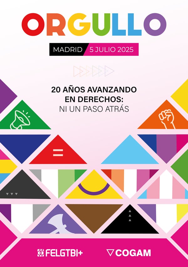 La Federación Estatal LGTBI+ (FELGTBI+) y COGAM, el colectivo LGTBI+ de Madrid, entidades convocantes del Orgullo Estatal LGTBI+, han anunciado que el lema de este año será “20 años avanzando en derechos: ni un paso atrás”. Esta consigna encabezará la pancarta principal de la gran manifestación estatal, que recorrerá el madrileño paseo del Prado desde Atocha hasta Colón el próximo sábado 5 de julio.