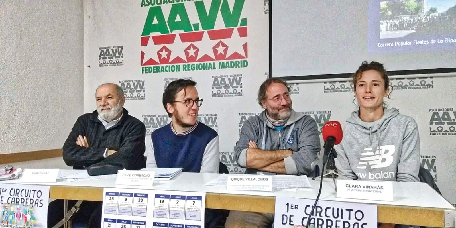 La Unión de Carreras de Barrio de Madrid, que vio la luz el 17 de mayo de 2018, está compuesta por entidades que organizan 23 de estas competiciones. Su primer circuito incluye 14 de esas pruebas, “que recorrerán 11 distritos y que pondrán en marcha 9 asociaciones vecinales y 5 clubes elementales o federados”, informó Quique Villalobos, presidente de la FRAVM, en una rueda de prensa que compartió con otros impulsores de la UCBM. Junto a él se sentaron Isaías Díaz, todo un veterano del atletismo de base y miembro de la Agrupación Deportiva Marathon, que hizo las veces de maestro de ceremonias; David Corbacho, auténtica alma mater de la UCBM; y Clara Viñarás, atleta internacional que en 2018 consiguió la medalla de bronce en el Campeonato de España de 3.000 metros obstáculos.